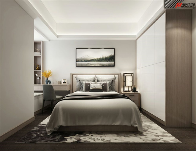 臥室采用灰調元素緊跟現代時尚潮流,將現代風展現的淋漓盡致,房間的中央地毯跟整體色調相協調,既配合了主題,使其不止有唯美的感覺。反襯白色背景和原木紋肌理線條清秀而素雅,與靜謐灰調、床上用品的氛圍相融,在簡約中展現藝術的氣息。