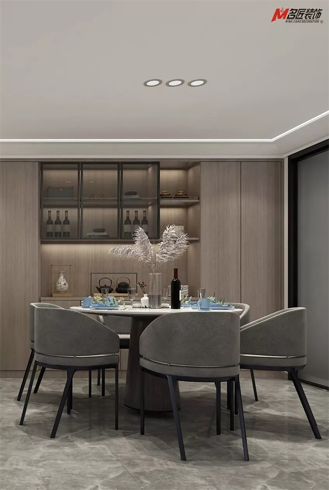 客餐廳互為一體的融合關系,最大限度地利用了光源,在轉瞬即逝的光影變化中體驗材料的細節之處。原木紋墻柜、大理石餐桌、時尚餐椅、簡約風射燈,舒適的令人對每日三餐充滿向往和期待。