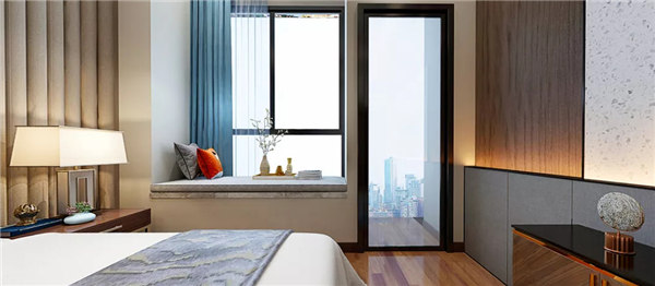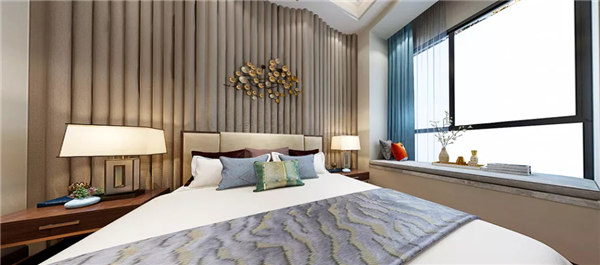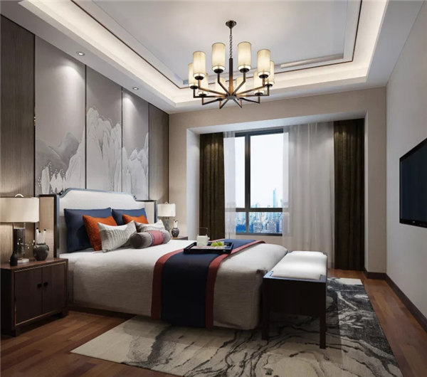 臥室色彩比較沉穩低調,在用色上偏向舒緩、雅致,整體簡潔而不失優雅。新中式燈具色彩鮮明,光線柔和,給人一種溫馨、寧靜的感覺。