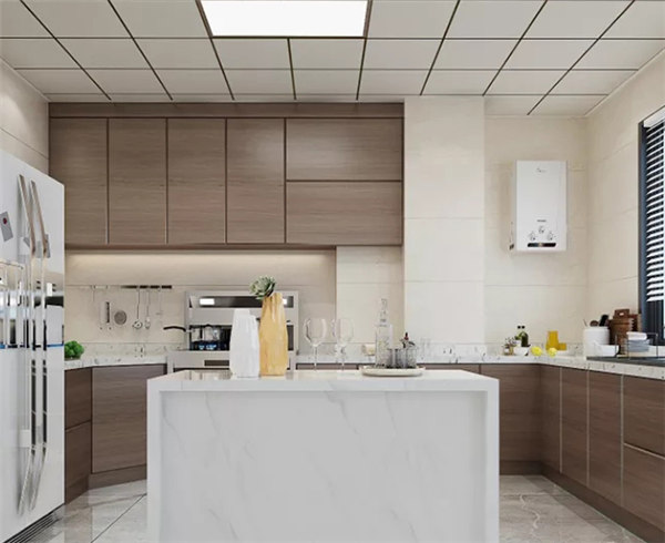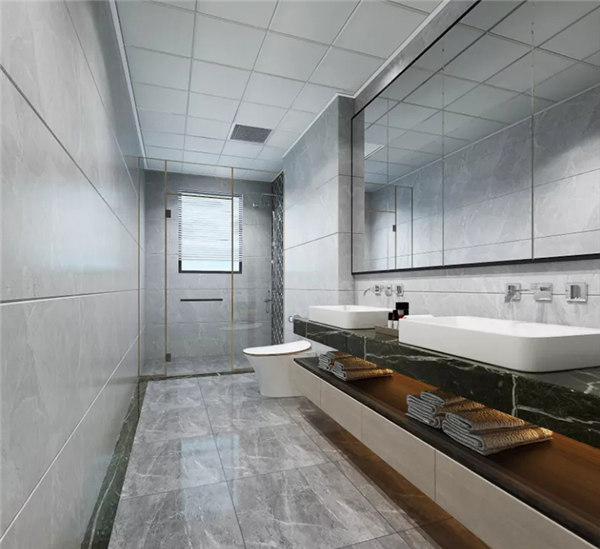 采用硬朗簡潔的直線條,使空間具有層次感;家具顏色以深色為主,蘊含深厚沉穩的底蘊,搭配木質櫥柜與大理石石紋瓷磚,呈現出簡雅低沉的氣質,整體設計兼具觀賞與實用性。
