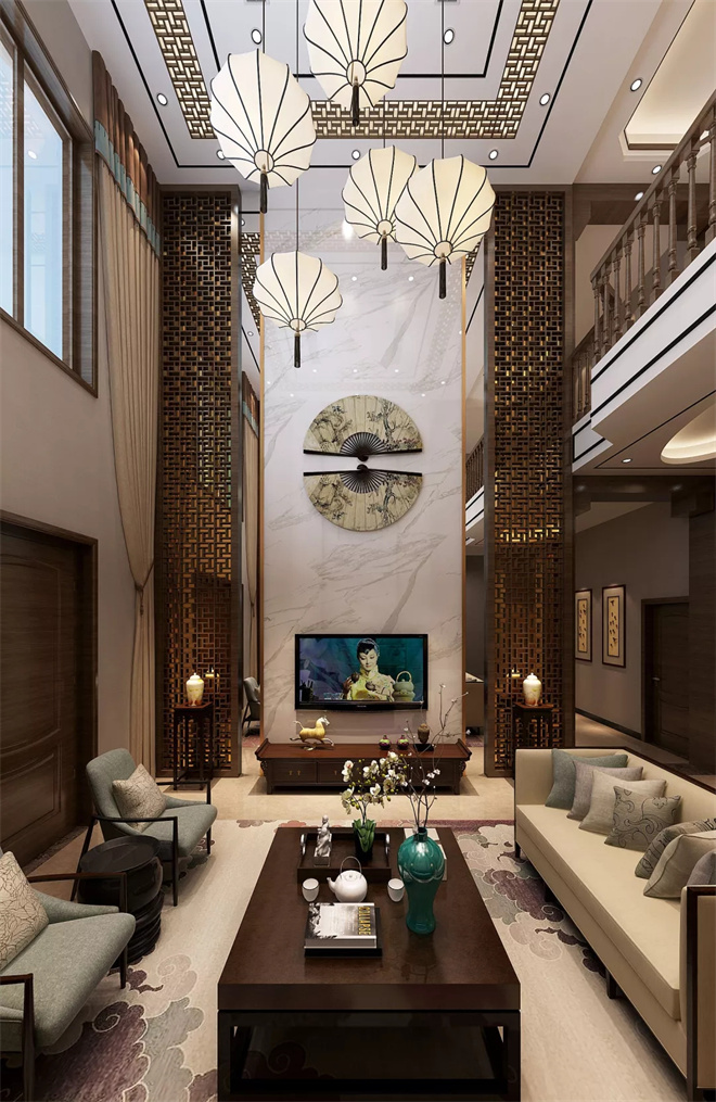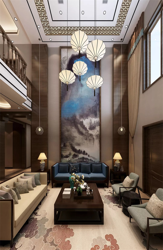 兩層樓高的客廳大氣磅礴,前后結(jié)構(gòu)對稱,不同造型的新中式燈具加上巨幅山水畫。客廳空間非常開闊,四面通透,中式的大圓桌象征了一家人和和美美