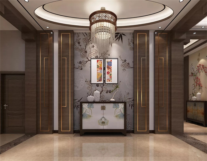 過道造景,與玄關(guān)相呼應(yīng),拼花掛畫化解了實木柜的厚重,點綴整個意境。