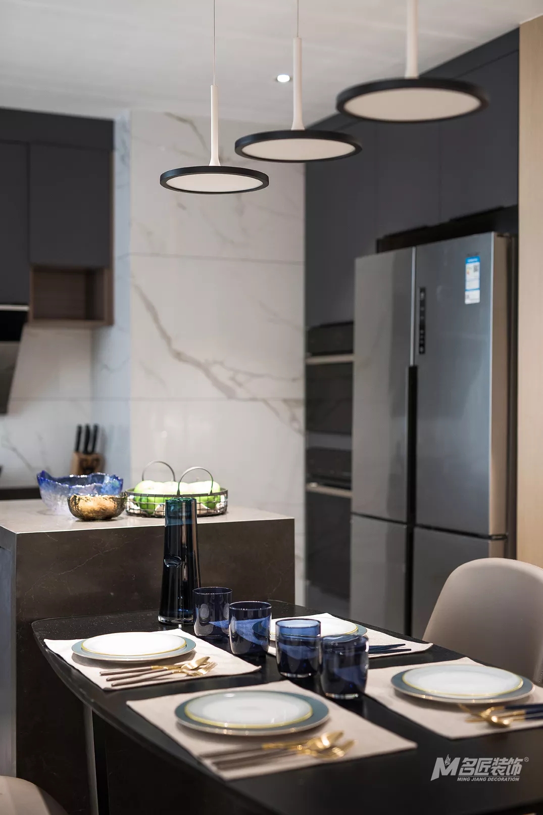 廚餐廳的另一端,墻面設計了木制隔板并裝飾了一些小物品,為烹飪、就餐時光增添了不少情趣。