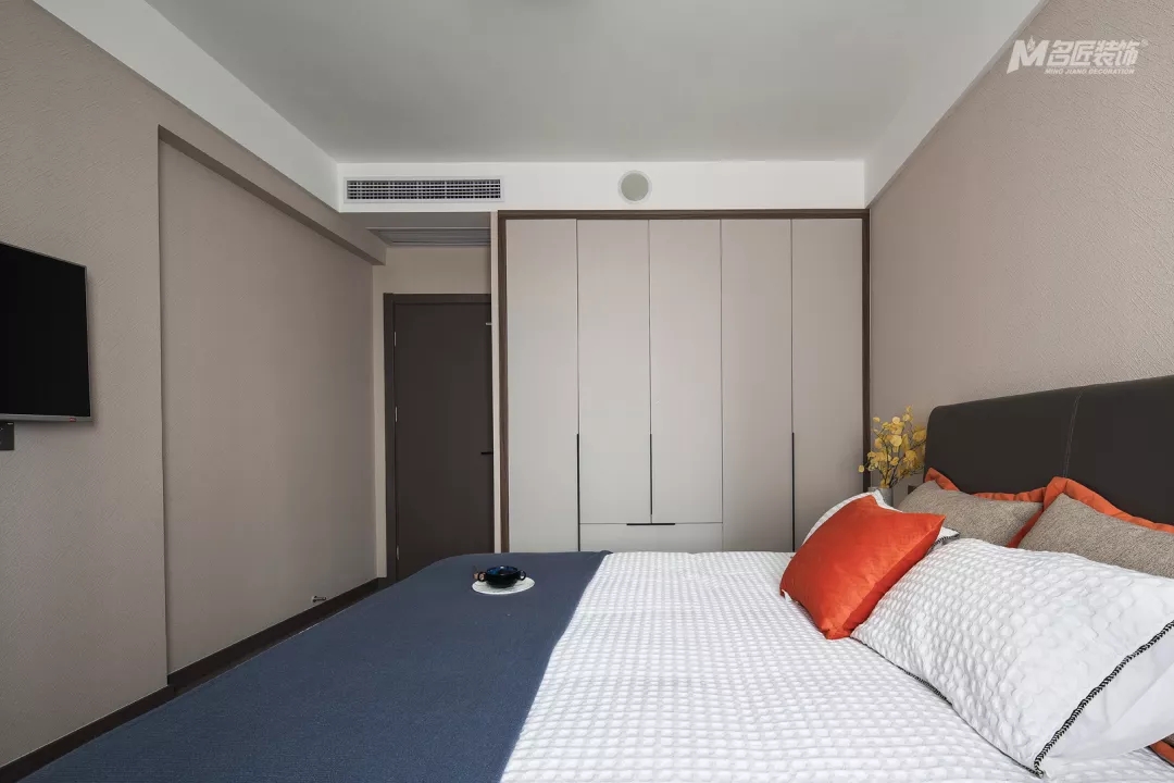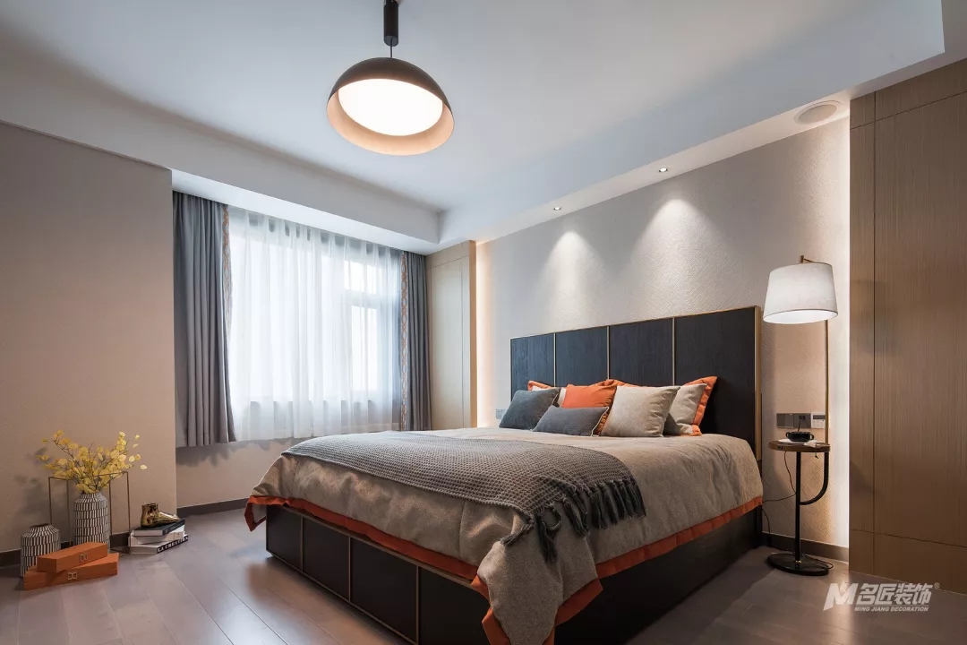 主臥的吊燈簡約時尚,整個房間的設計簡單但很有質感和品味。