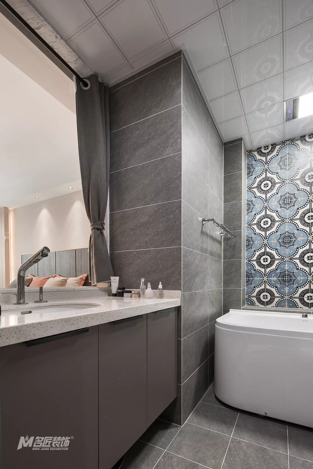 主臥套房內的衛生間,延續整體風格的高級灰色調,彰顯時尚潮流的同時,也顯得空間更加干凈整潔。