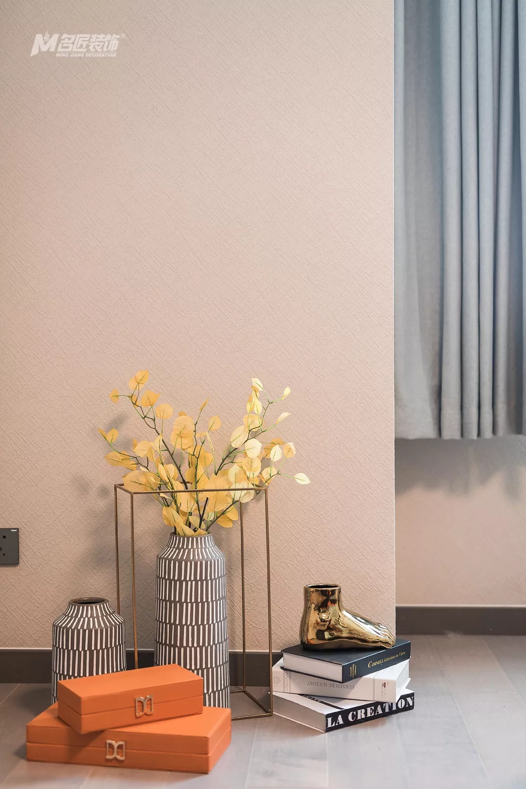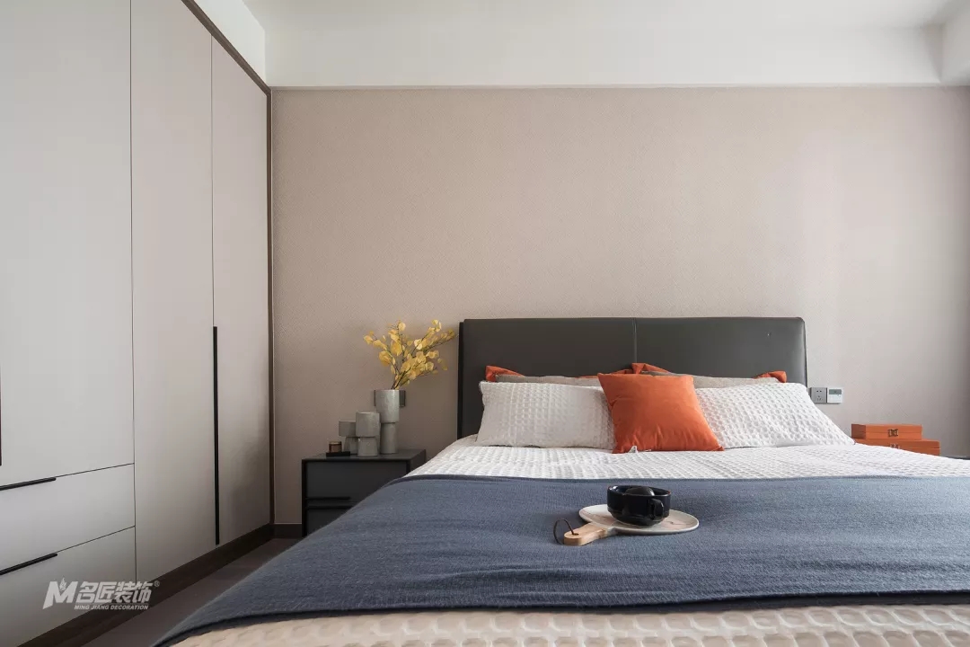 高級灰是一種不張揚的色彩,雖沒有白色的純凈,也沒有黑色的深邃,但是和其他色彩的相輔相成,會營造出極為精致的空間氛圍,而在本案中,高級灰將會與愛馬仕橙、原木色相互融合,帶來極為時尚精致的家。