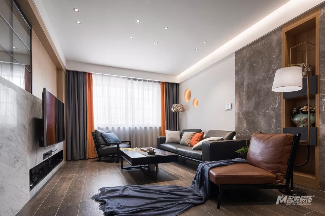 整潔清爽的客廳,由高級灰搭配著原木色、愛馬仕橙,時尚氣息濃郁,又有著自然的溫暖感受。